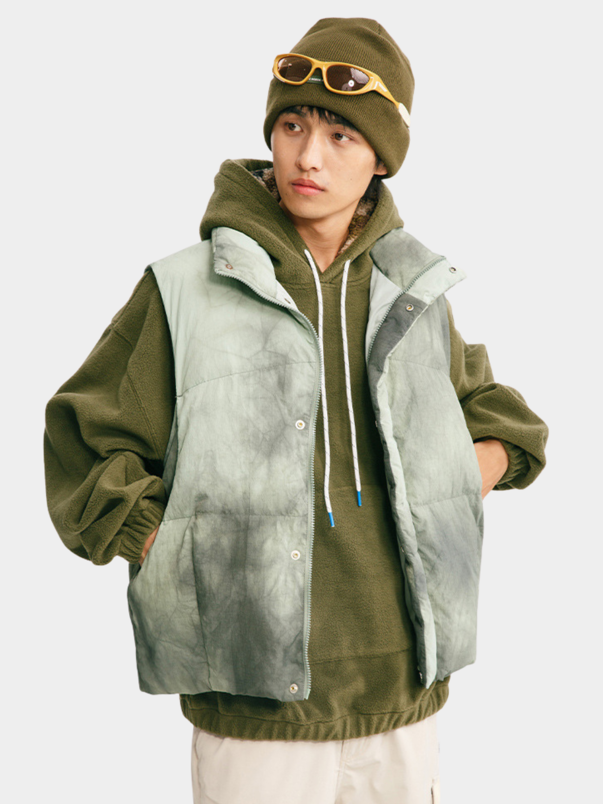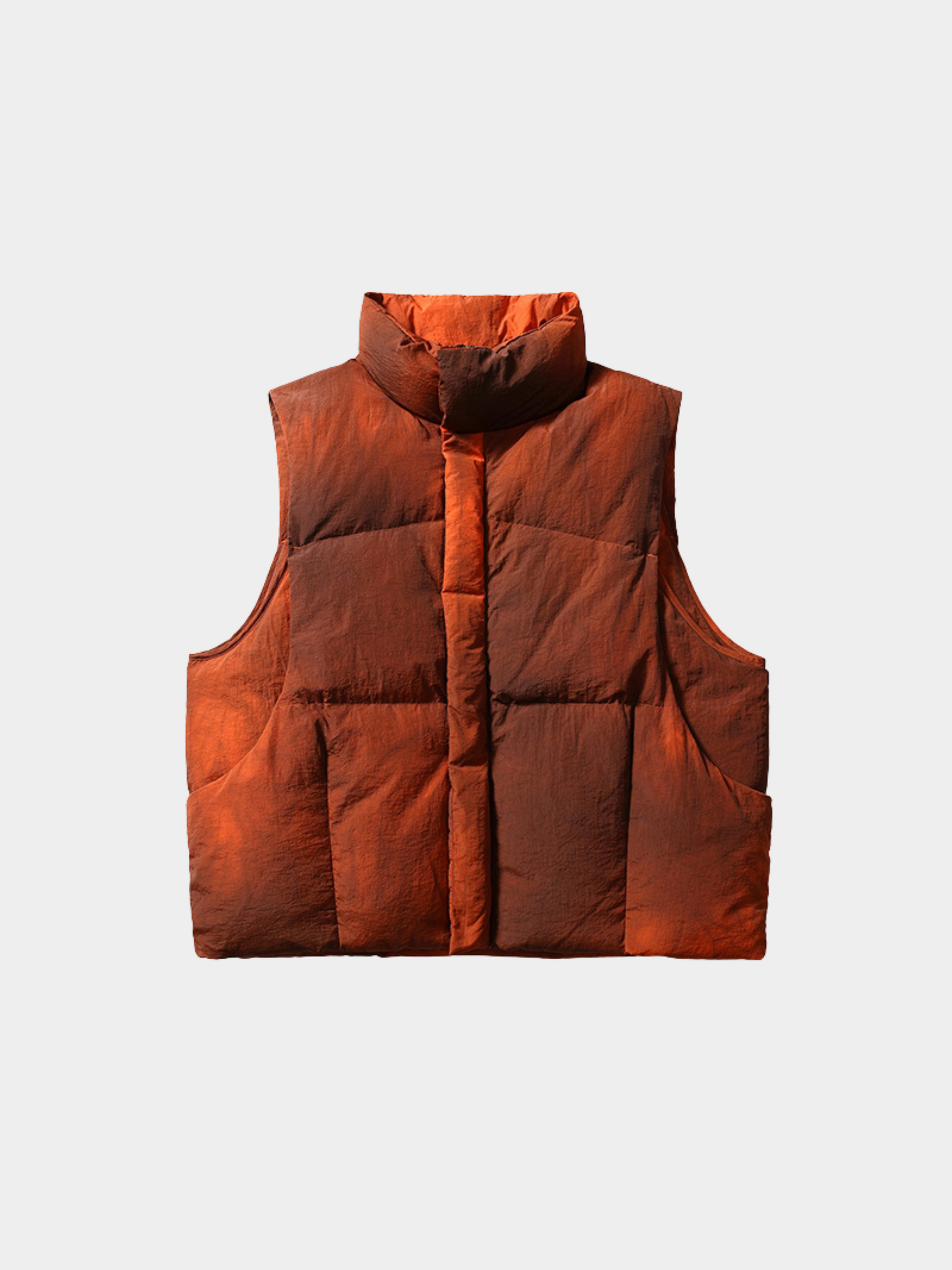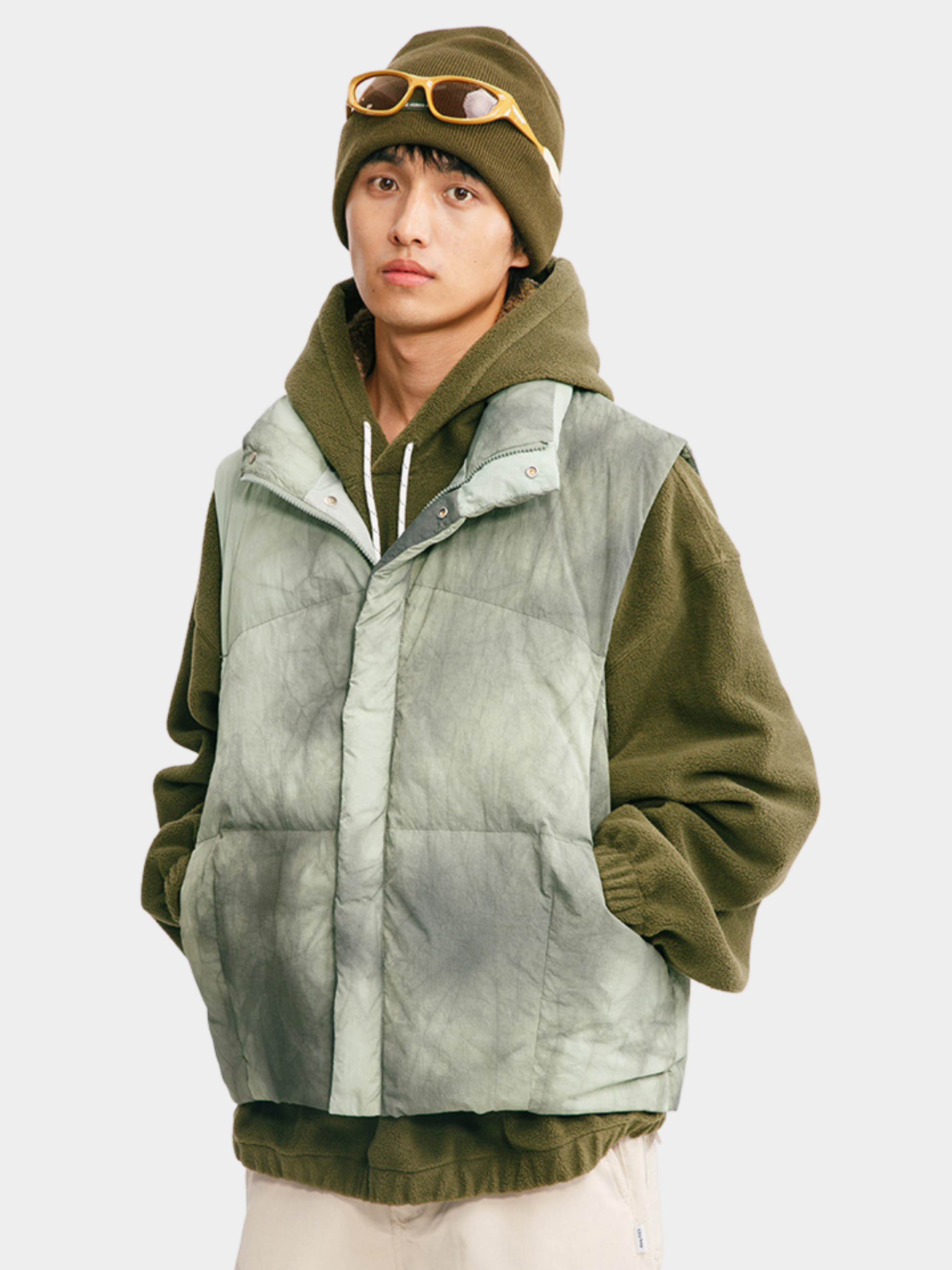 Jedes Stück der handgefärbten Daunenweste ist einzigartig, gefertigt aus maßgeschneidertem Nylonstoff mit handwerklichen Batiktechniken. Gefüllt mit 90% weißen Entendaunen und mit einer geräumigen Armloch- und Stehkragen-Silhouette gebaut, bietet sie sowohl Isolierung als auch Komfort. Eine Fusion aus Individualität und Leistung.
