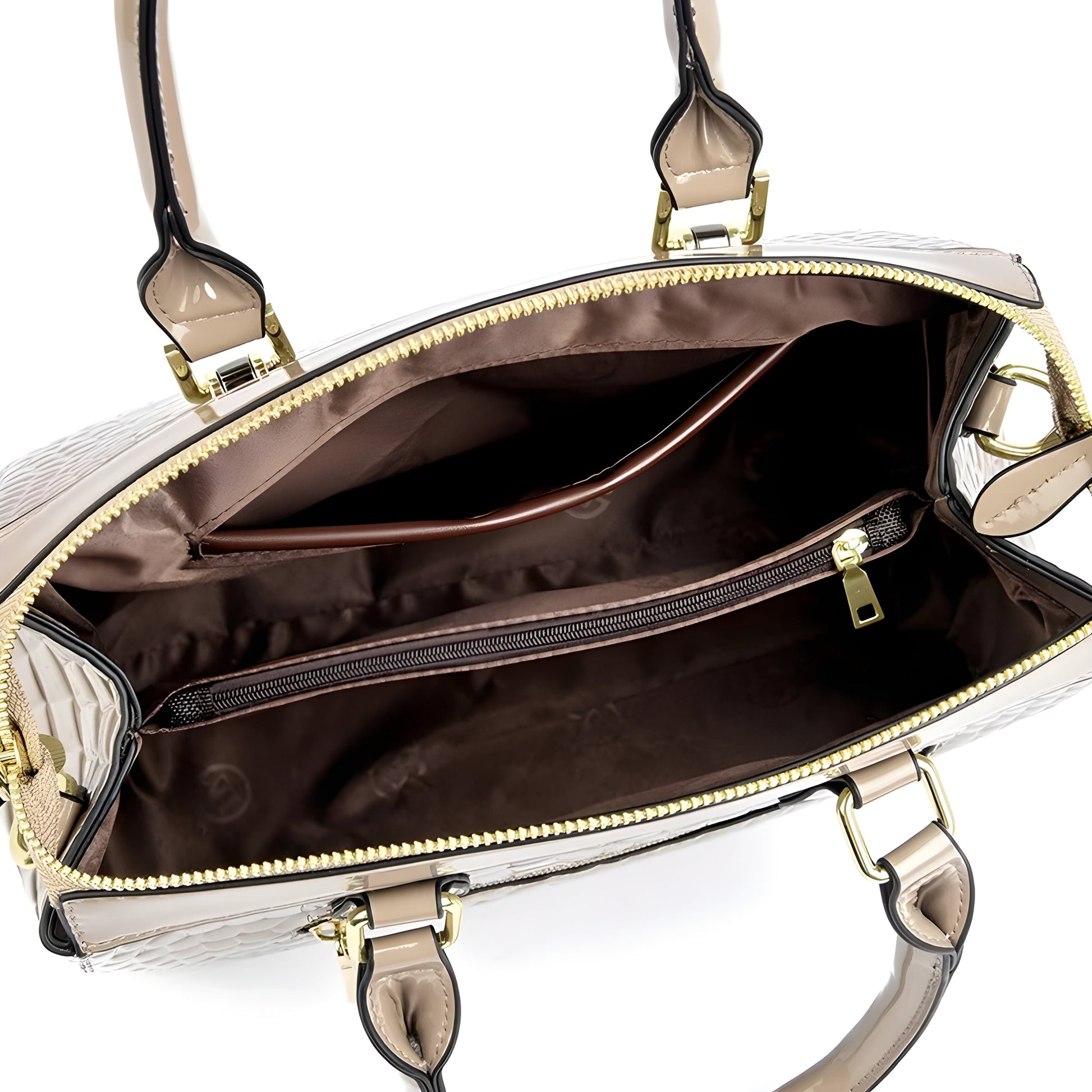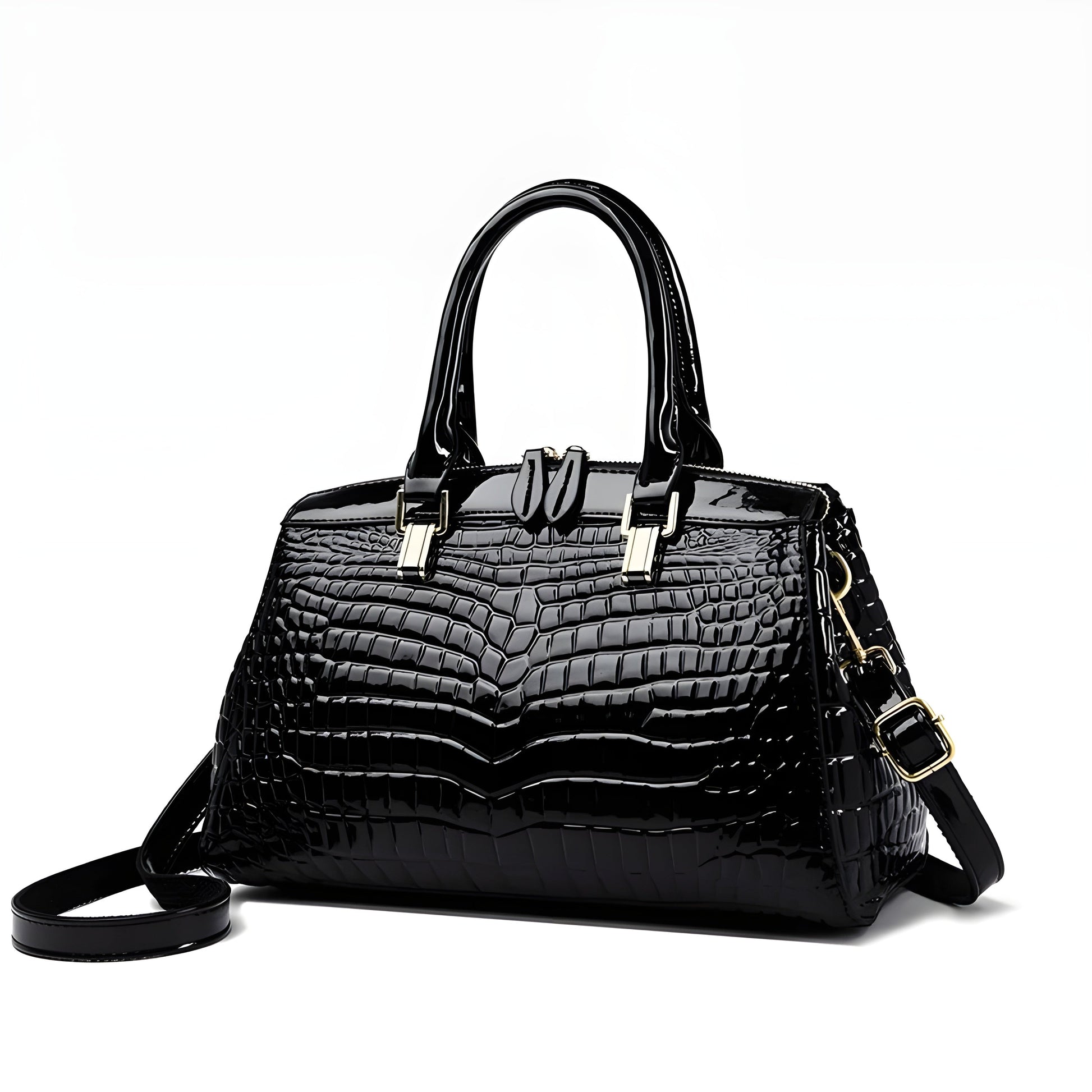 Wunderschönes Farbverlaufmuster hebt das schlanke, geprägte, vegane Krokodilleder-Canvas in einem atemberaubenden Glanzfinish kühn hervor. Eine solide, kastenförmige Bauweise mit mehreren Griffen für Funktionalität und eleganten, vergoldeten Beschlägen fügt einen subtilen Akzent hinzu, der das Gesamtbild ergänzt.
