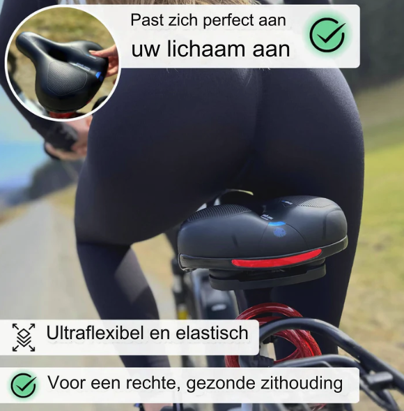 Der CloudComfort Max Fahrradsattel bietet maximalen Sitzkomfort und passt sich dank seines extra weichen und flexiblen Materials perfekt an deinen Körper an. Dies gewährleistet eine korrekte Sitzposition. Es fühlt sich an, als würdest du auf Wolken fahren!