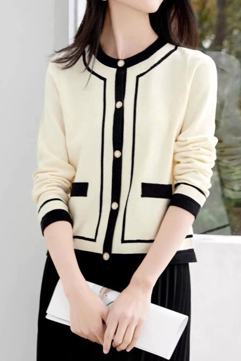 Eleganter lockerer, farbblockierter, einreihiger Knopf-Cardigan mit langen Ärmeln
