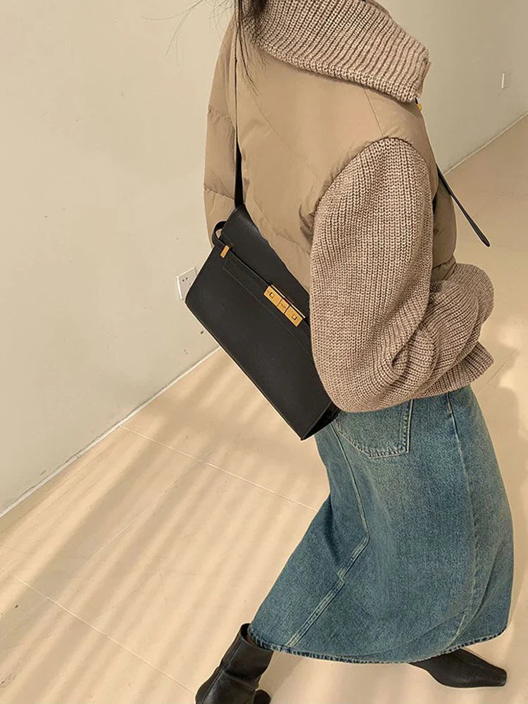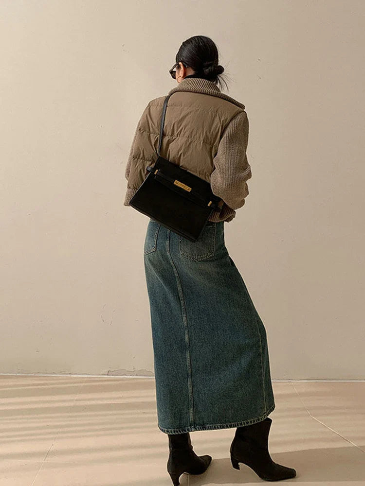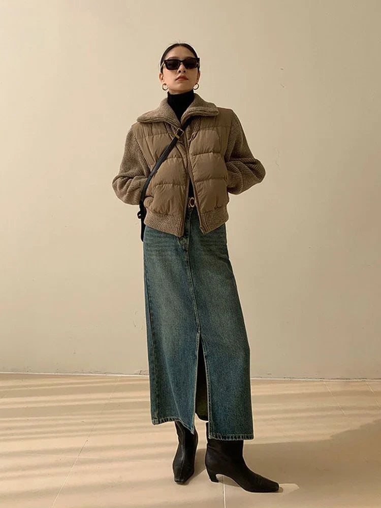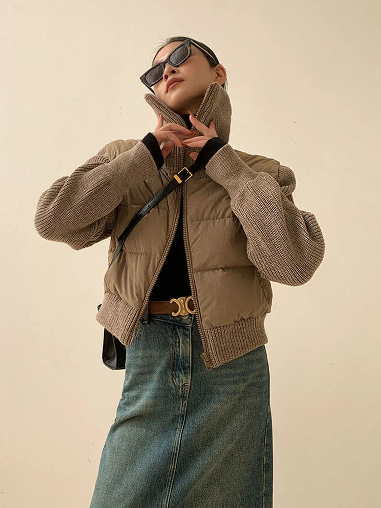 Ein wunderschönes, nude monochromes Design mit einer dicken, gepolsterten Außenschicht, die wunderschön auf weichem, atmungsaktivem Strick gepatcht ist. Ein niedlicher, übergroßer Kragen verleiht einen charmanten Akzent, während die engen, gerippten Bündchen im Kontrast zu den voluminösen, drapierten Ärmeln für einen schicken Look stehen.