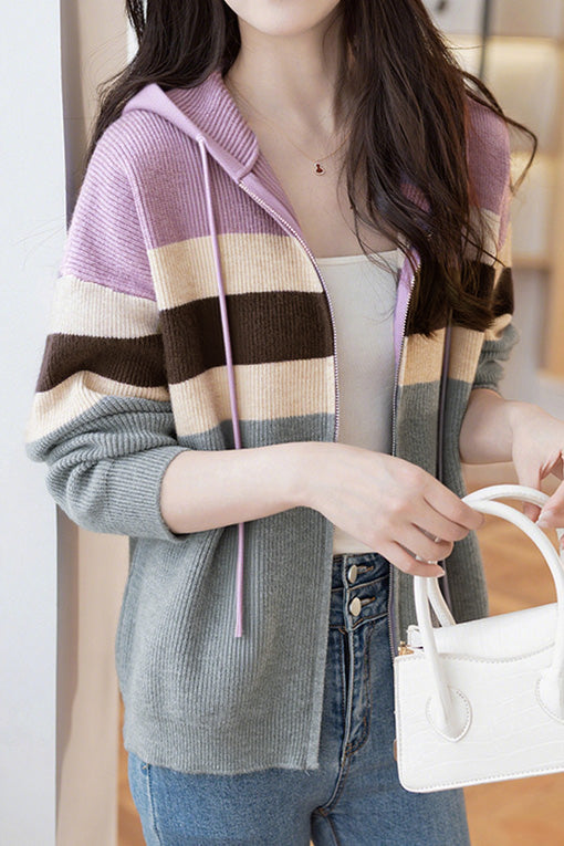 Dieser gestrickte Cardigan verfügt über ein Farbkombinationsdesign mit Kapuze und langen Ärmeln. Die Kapuze ist mit einem verstellbaren Kordelzug ausgestattet, und es gibt einen beidseitigen Reißverschluss vorne für ein einfaches An- und Ausziehen. |