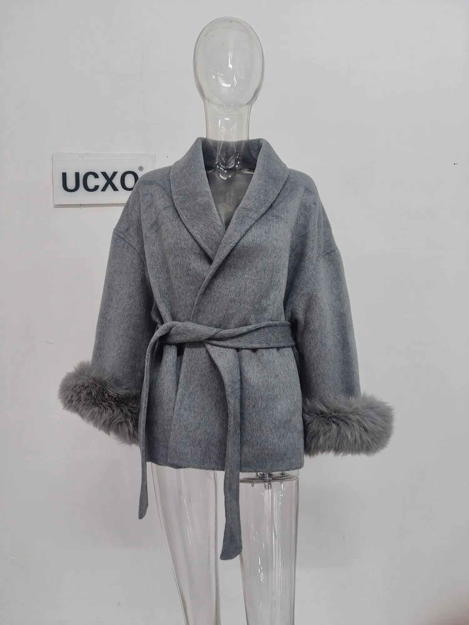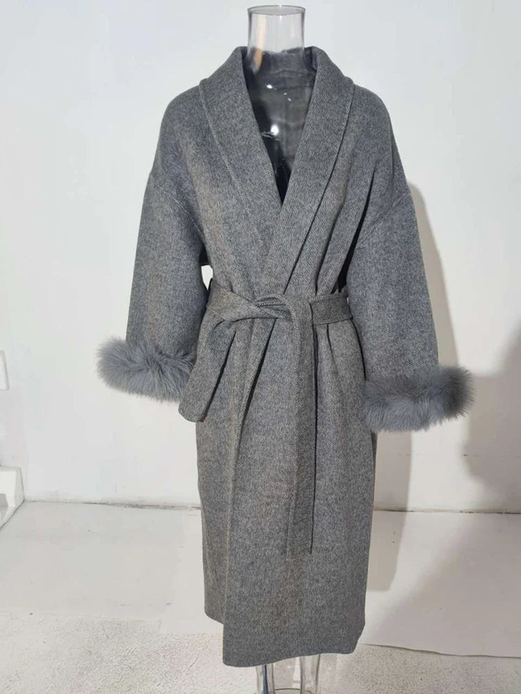 Wählen Sie einen eleganten und raffinierten Look mit diesem Wollmantel. Sein anspruchsvolles Patchwork, kombiniert mit langen Ärmeln, die mit Pelz verziert sind, schafft eine schicke und warme Ausstrahlung. Perfekt für die Übergangszeit, kann er sowohl im Büro als auch beim Ausgehen getragen werden, um einen Hauch von Eleganz zu verleihen.
