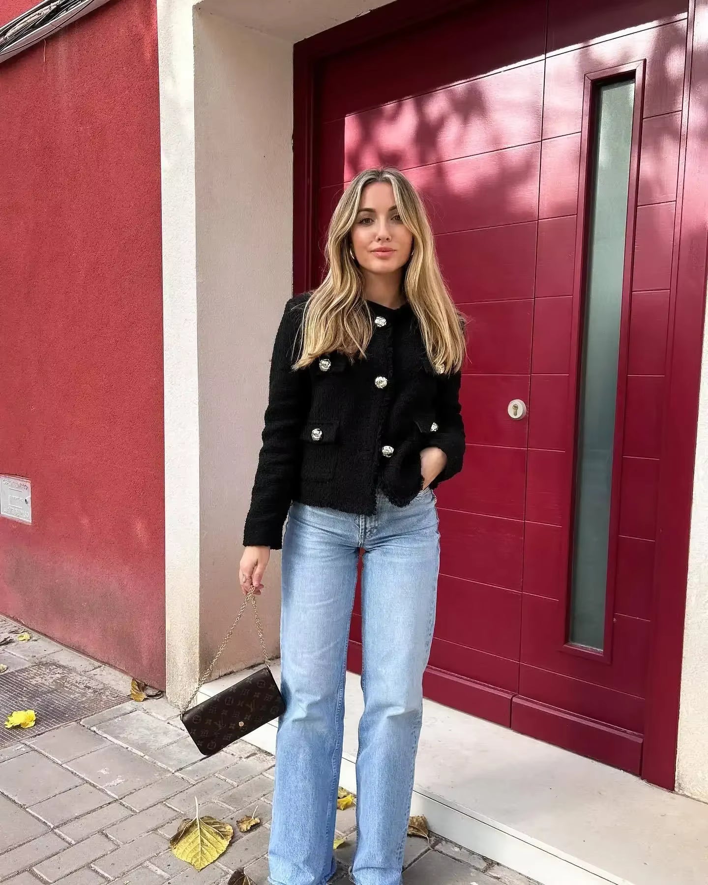 Lassen Sie sich von unserer Tweed-Chic- und Zeitlosen Jacke von Mystique & Co™ verzaubern. ✨ Hergestellt aus weichem Tweed mit strukturiertem Fall, vereint sie Komfort und Raffinesse mit natürlicher Eleganz. Ihr kurzer Schnitt, der rundhals und die dekorativen Knöpfe formen eine moderne Silhouette, die sich für alle Anlässe eignet — vom Kaffeeklatsch mit Freundinnen bis zu nächtlichen Ausflügen in der Stadt. 😍