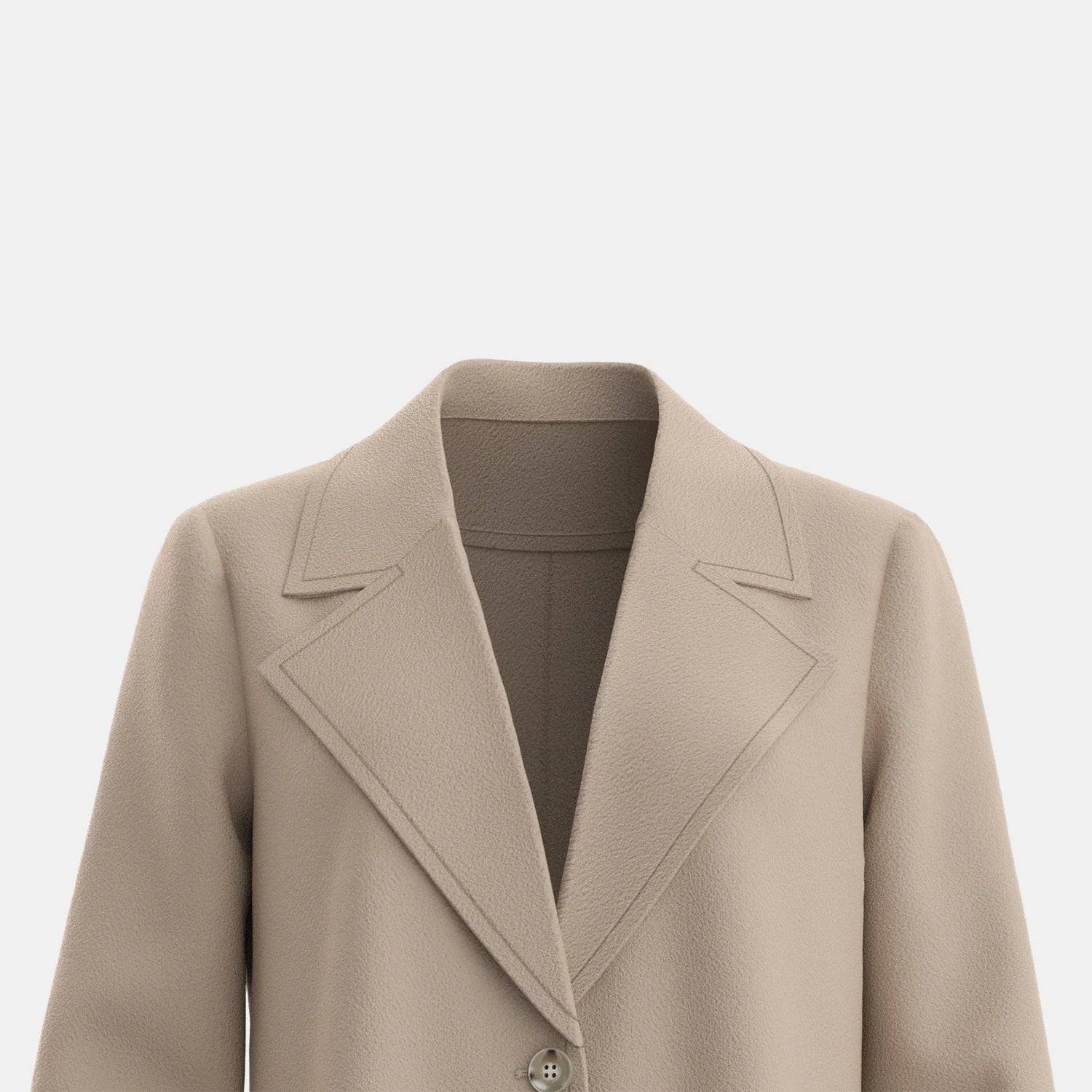 Ein strukturierter Schnitt mit einem strukturierten nude-farbenen Canvas, maßgeschneidert auf eine schicke knielange Länge. Das lockere Design verfügt über einen scharfen Reverskragen, der in der Taille mit zwei auffälligen Kunsthornknöpfen in einer einreihigen Verschlussform cinched, während die ausgestellte Silhouette einen smarten, lässigen Touch hinzufügt.