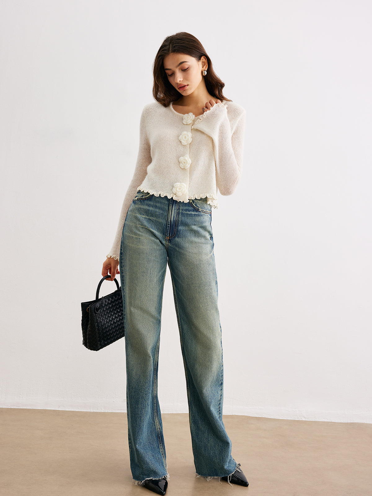 Wollmischung Volant 3D Blumen Detail Cardigan